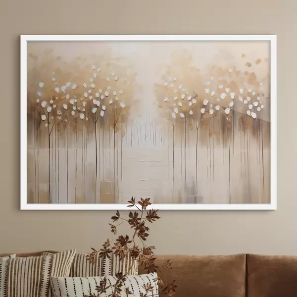 Poster Ölgemälde Nachahmung von braunen Bäumen mit weißen Blättern in einem Wald mit einem Fluss in der Mitte, weißer Hintergrund f43172