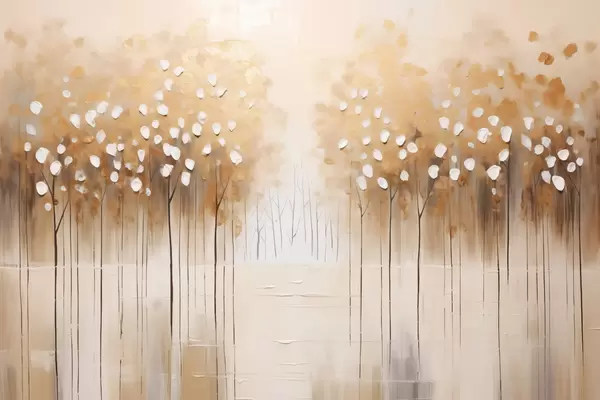 Poster Ölgemälde Nachahmung von braunen Bäumen mit weißen Blättern in einem Wald mit einem Fluss in der Mitte, weißer Hintergrund f43172