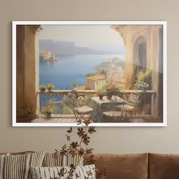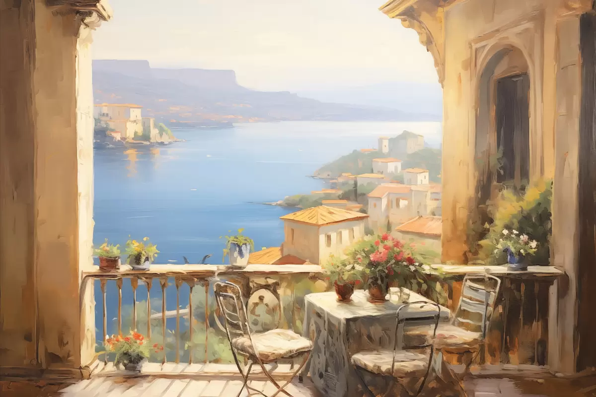 Poster Ölgemälde Nachahmung von Balkon mit Blumen, mit Blick auf das Meer, Häuser an der Küste, sonniger Tag, blauer Himmel Nr f43173