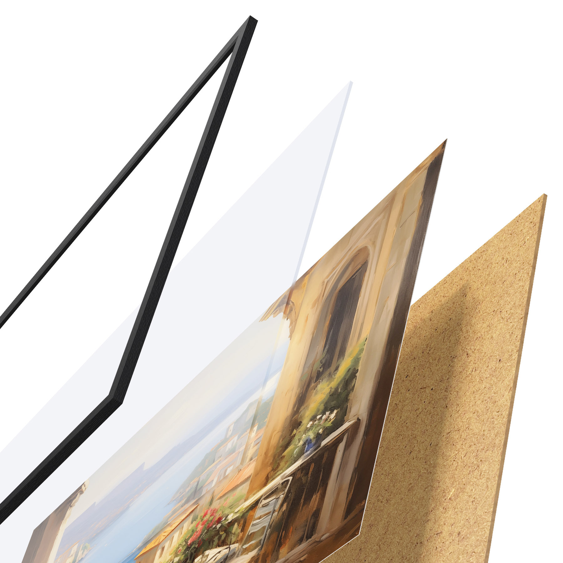 Poster Ölgemälde Nachahmung von Balkon mit Blumen, mit Blick auf das Meer, Häuser an der Küste, sonniger Tag, blauer Himmel f43173