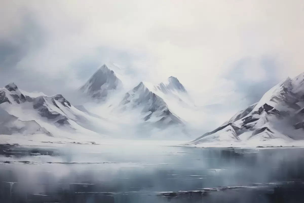 Poster Verschneite Berglandschaft mit einem See im Vordergrund, die Gipfel sind mit Schnee bedeckt und der Himmel ist bewölkt Nr f43174