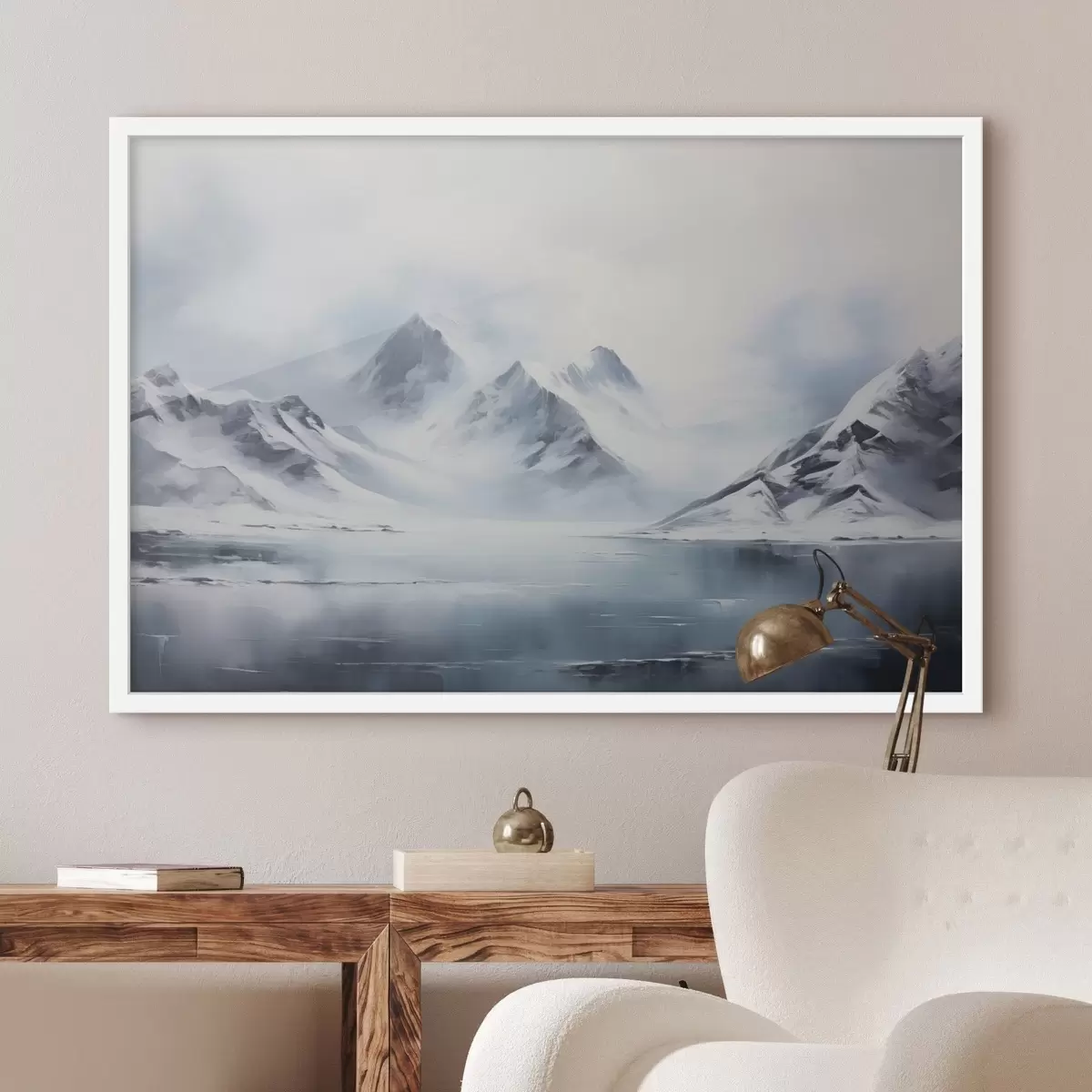 Poster Verschneite Berglandschaft mit einem See im Vordergrund, die Gipfel sind mit Schnee bedeckt und der Himmel ist bewölkt f43174