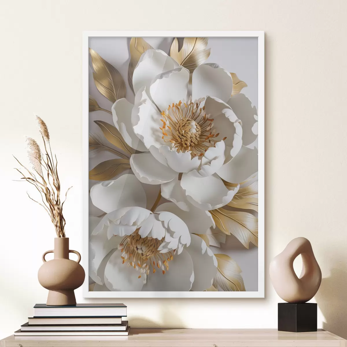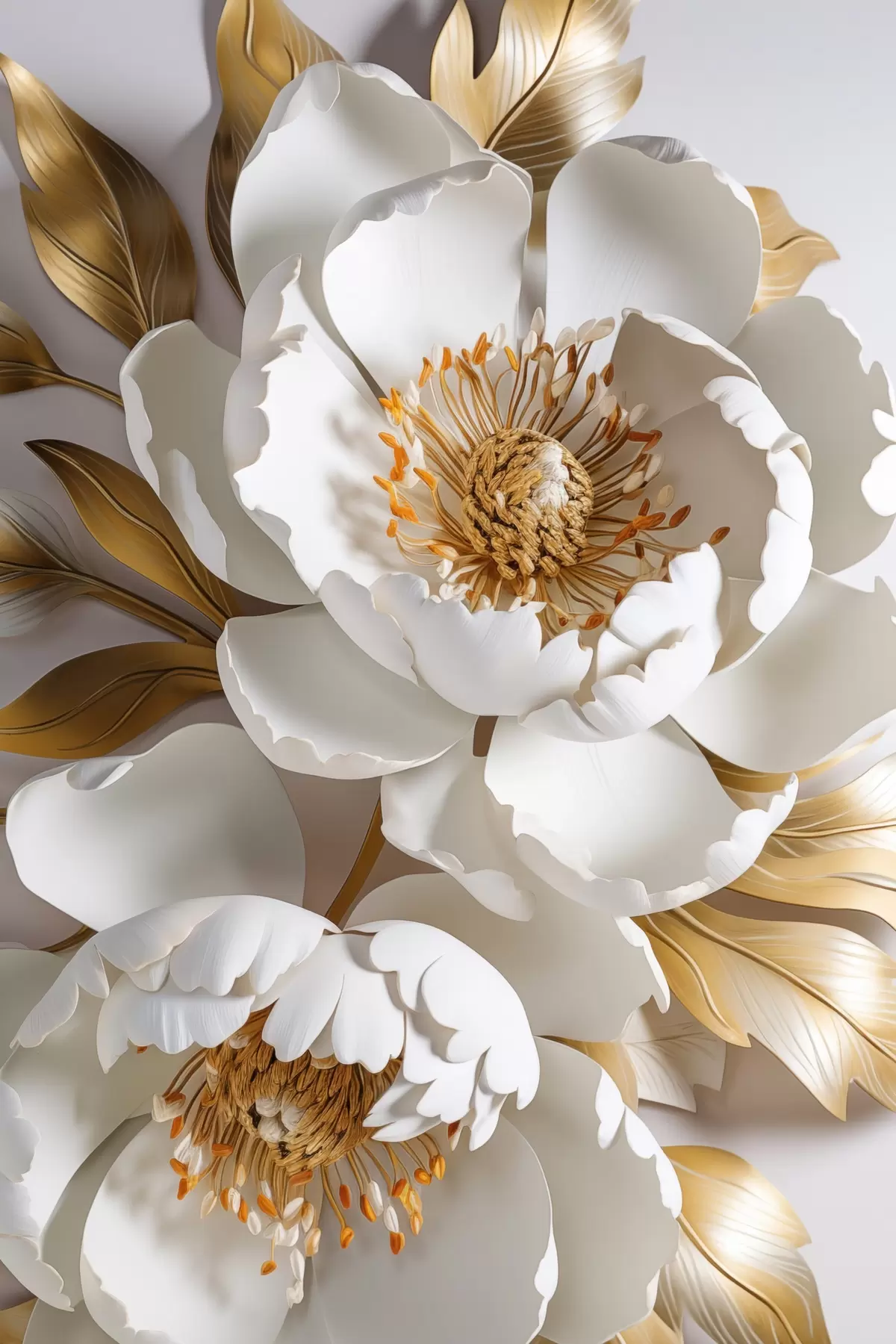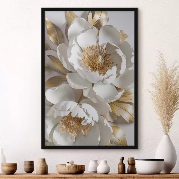 Poster Weiße zarte detaillierte dekorative Pfingstrose Blumen mit gelben Blättern, ist der Hintergrund eine hellgraue Farbe Nr f43176