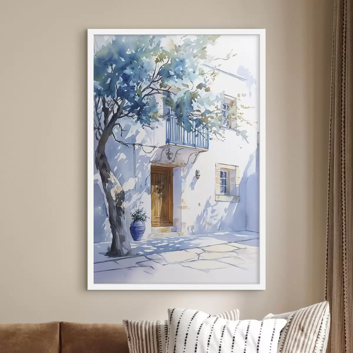 Poster Aquarellstil, griechisches Haus, blühender Baum, Architektur Nr f43182