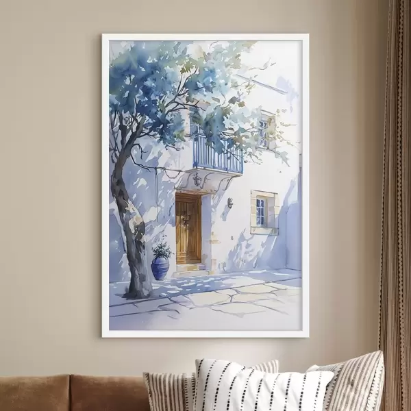 Poster Aquarellstil, griechisches Haus, blühender Baum, Architektur f43182