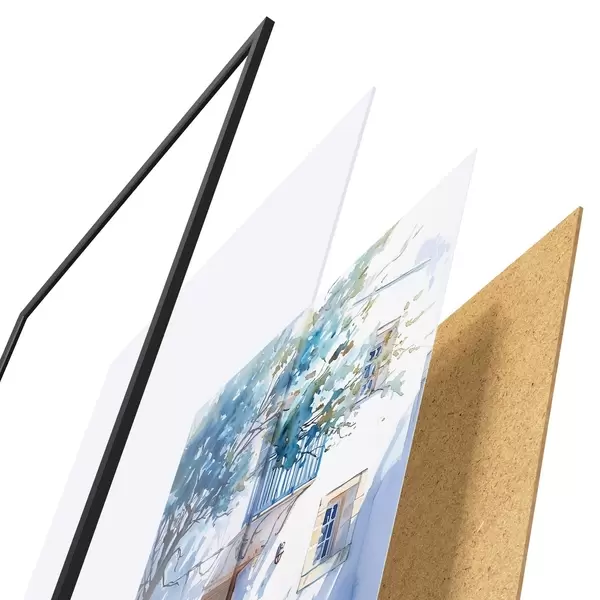 Das Poster besteht aus einem Rahmen, Plexiglas, einem gedruckten Bild und einer Rückwand aus Spanplatten. Dank der Halterungen auf der Rückseite kann das Poster sofort an die Wand gehängt werden.