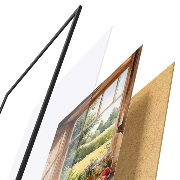 Das Poster besteht aus einem Rahmen, Plexiglas, einem gedruckten Bild und einer Rückwand aus Spanplatten. Dank der Halterungen auf der Rückseite kann das Poster sofort an die Wand gehängt werden.
