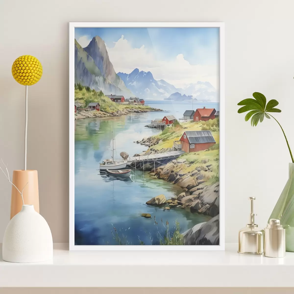 Poster Lofoten Inseln Sommerlandschaft, rote Häuser, Berge, Boote Nr f43187