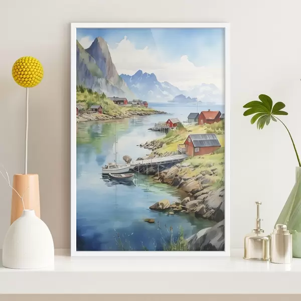 Poster Lofoten Inseln Sommerlandschaft, rote Häuser, Berge, Boote f43187