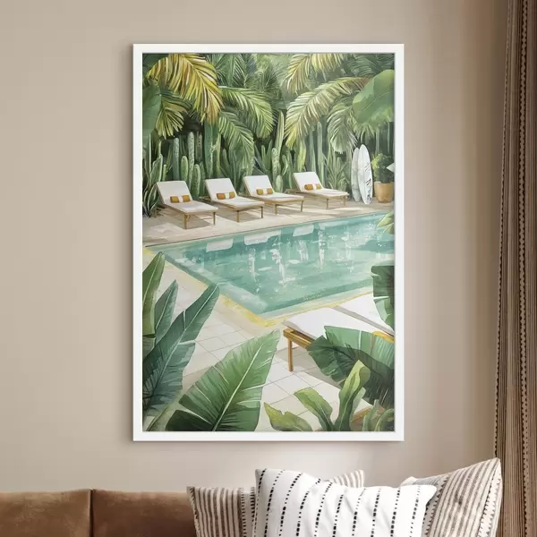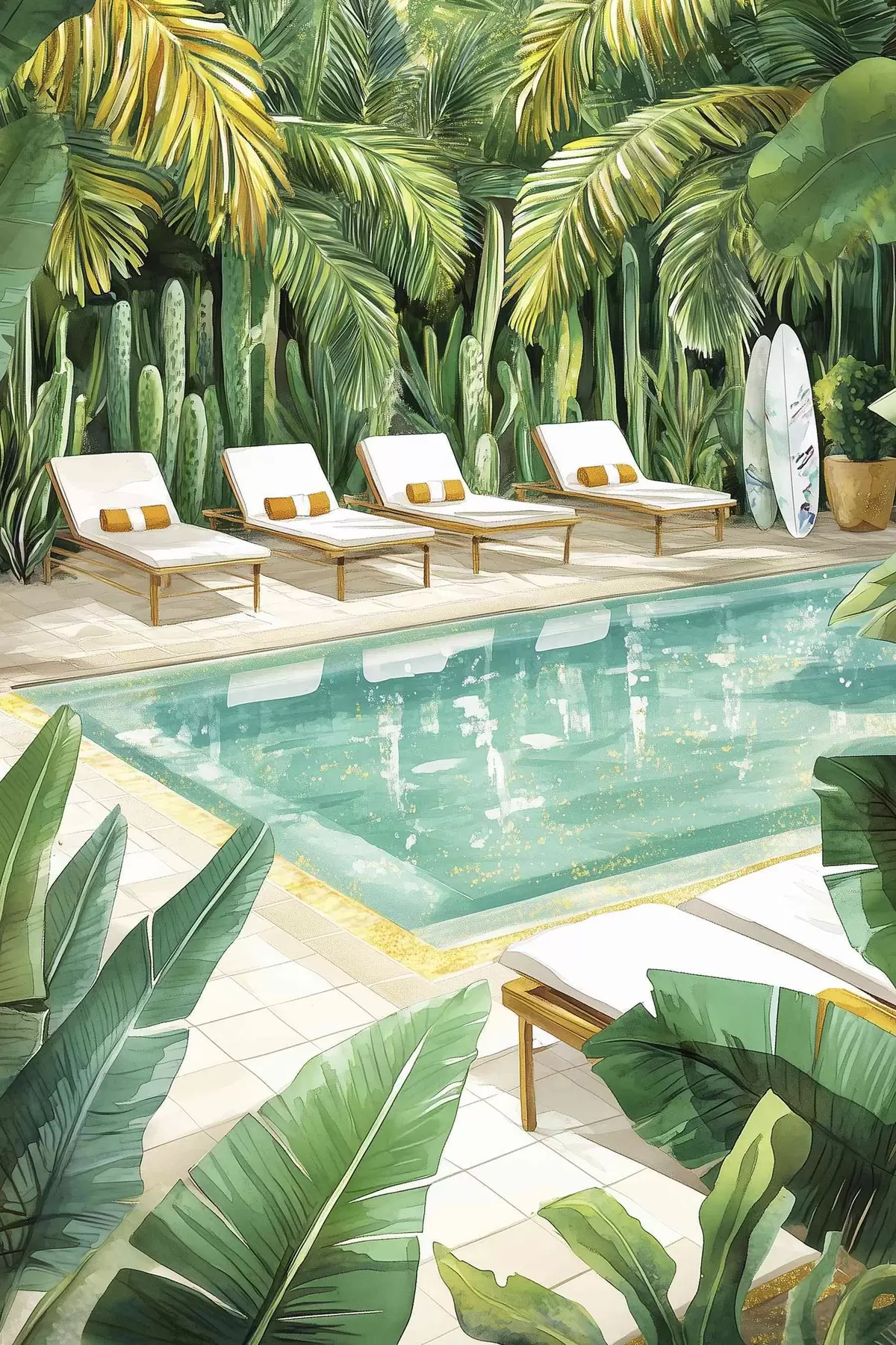 Poster Tropische Natur, Garten, Sommerpool, Surfen, Aquarellstil Nr f43190