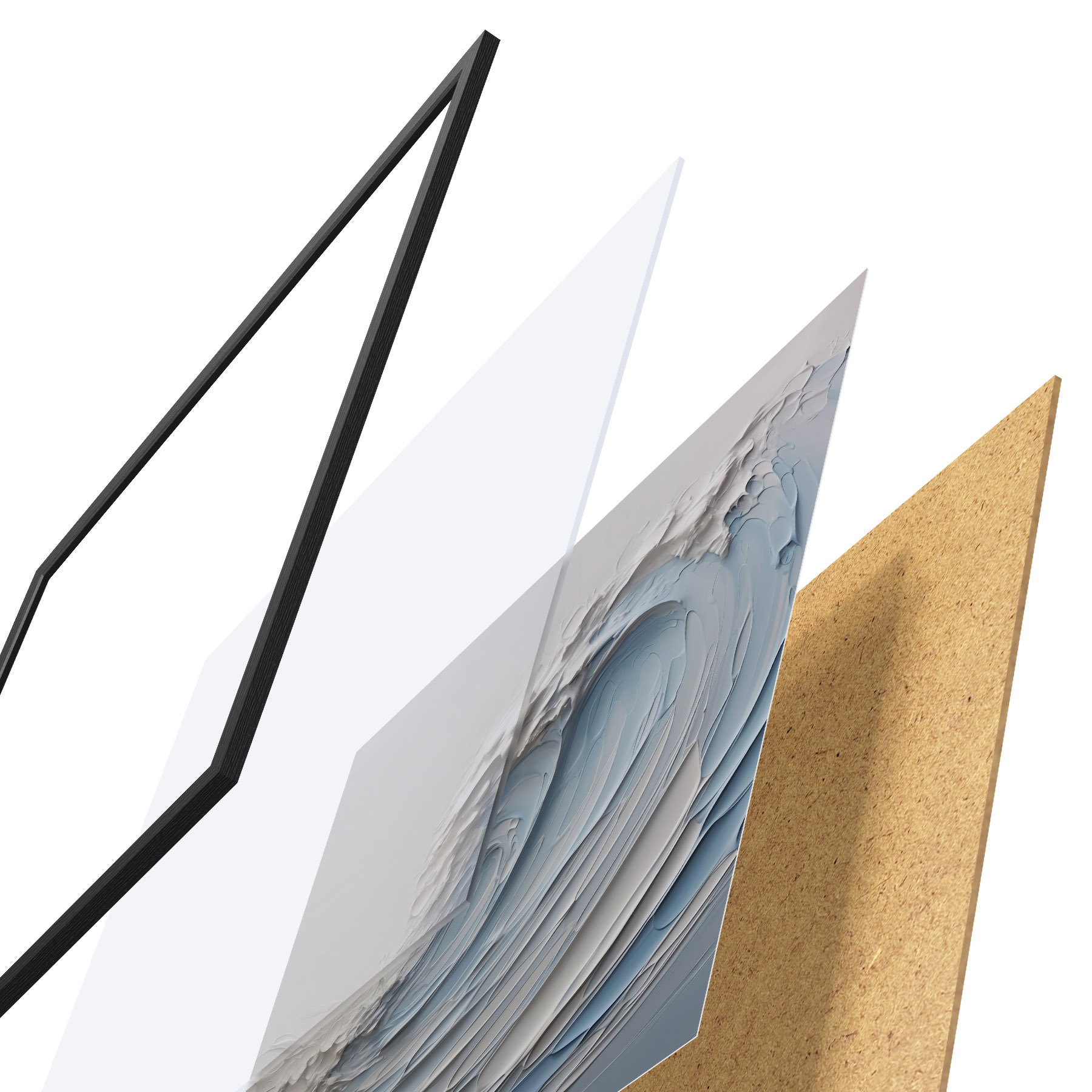 Das Poster besteht aus einem Rahmen, Plexiglas, einem gedruckten Bild und einer Rückwand aus Spanplatten. Dank der Halterungen auf der Rückseite kann das Poster sofort an die Wand gehängt werden.