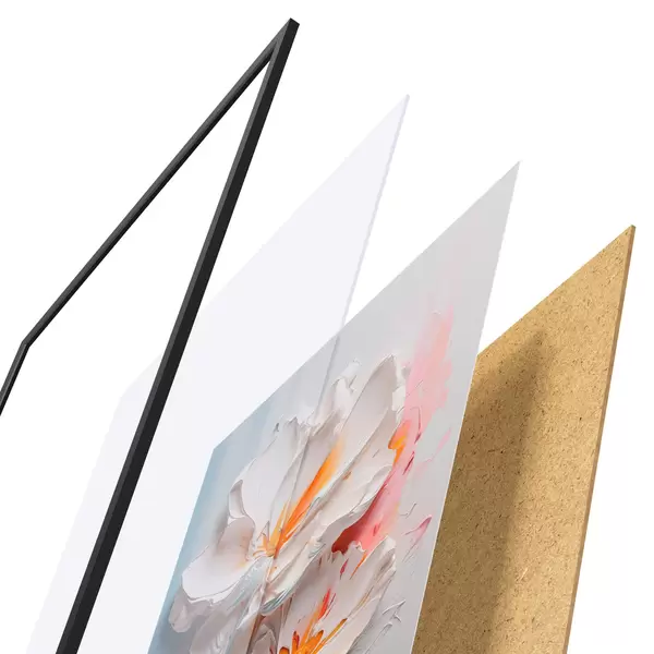 Das Poster besteht aus einem Rahmen, Plexiglas, einem gedruckten Bild und einer Rückwand aus Spanplatten. Dank der Halterungen auf der Rückseite kann das Poster sofort an die Wand gehängt werden.
