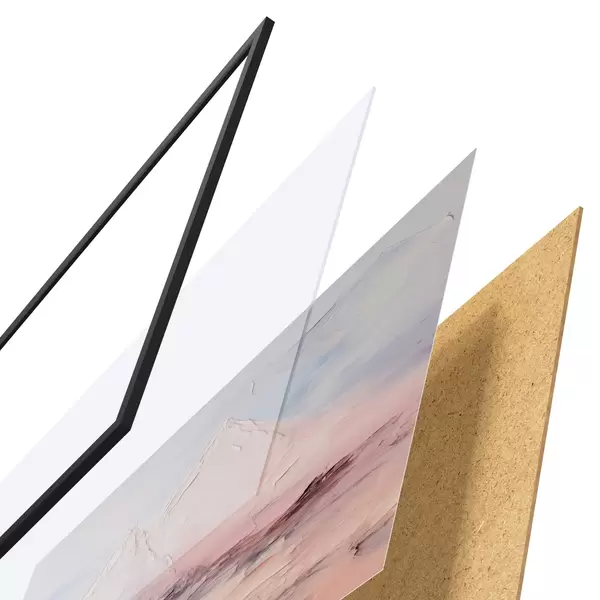 Das Poster besteht aus einem Rahmen, Plexiglas, einem gedruckten Bild und einer Rückwand aus Spanplatten. Dank der Halterungen auf der Rückseite kann das Poster sofort an die Wand gehängt werden.