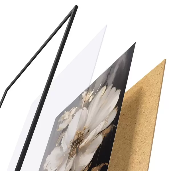 Das Poster besteht aus einem Rahmen, Plexiglas, einem gedruckten Bild und einer Rückwand aus Spanplatten. Dank der Halterungen auf der Rückseite kann das Poster sofort an die Wand gehängt werden.