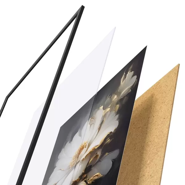 Das Poster besteht aus einem Rahmen, Plexiglas, einem gedruckten Bild und einer Rückwand aus Spanplatten. Dank der Halterungen auf der Rückseite kann das Poster sofort an die Wand gehängt werden.