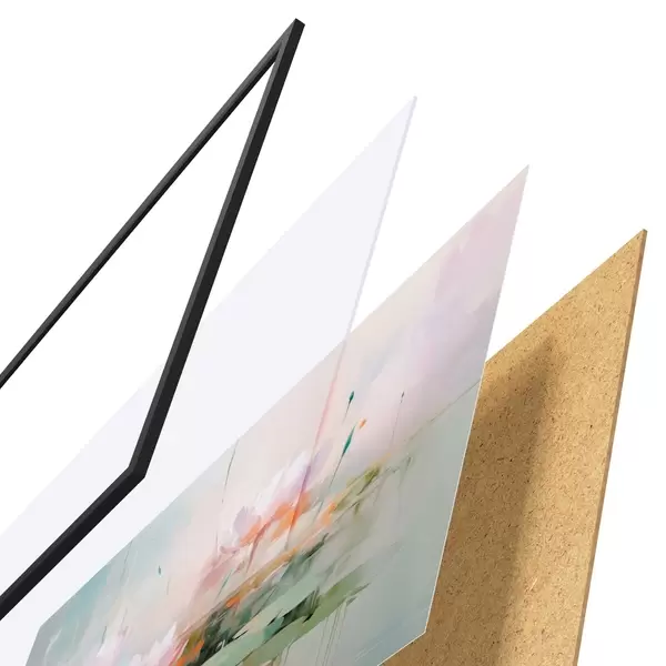 Das Poster besteht aus einem Rahmen, Plexiglas, einem gedruckten Bild und einer Rückwand aus Spanplatten. Dank der Halterungen auf der Rückseite kann das Poster sofort an die Wand gehängt werden.