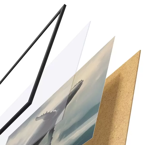 Das Poster besteht aus einem Rahmen, Plexiglas, einem gedruckten Bild und einer Rückwand aus Spanplatten. Dank der Halterungen auf der Rückseite kann das Poster sofort an die Wand gehängt werden.