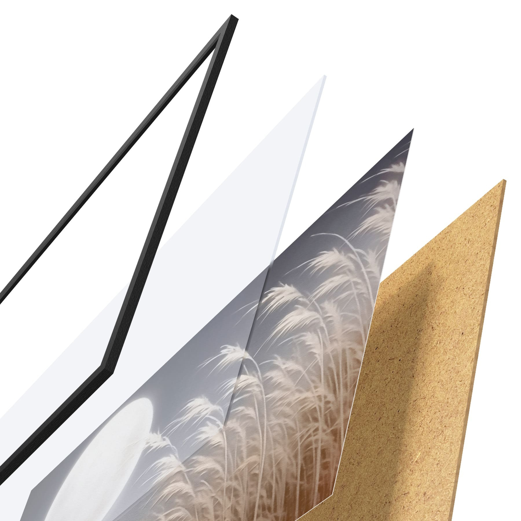 Das Poster besteht aus einem Rahmen, Plexiglas, einem gedruckten Bild und einer Rückwand aus Spanplatten. Dank der Halterungen auf der Rückseite kann das Poster sofort an die Wand gehängt werden.