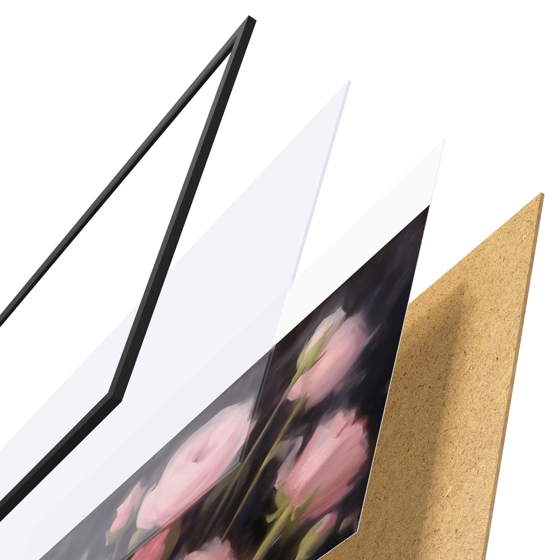 Das Poster besteht aus einem Rahmen, Plexiglas, einem gedruckten Bild und einer Rückwand aus Spanplatten. Dank der Halterungen auf der Rückseite kann das Poster sofort an die Wand gehängt werden.