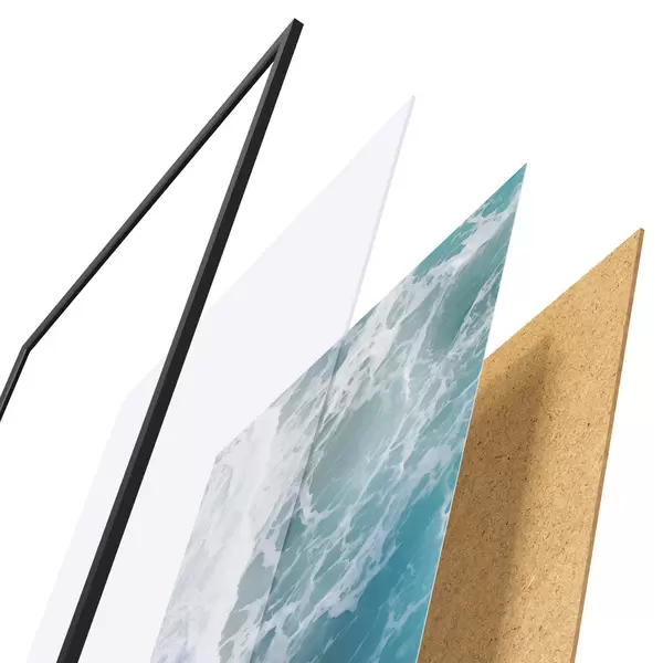 Das Poster besteht aus einem Rahmen, Plexiglas, einem gedruckten Bild und einer Rückwand aus Spanplatten. Dank der Halterungen auf der Rückseite kann das Poster sofort an die Wand gehängt werden.