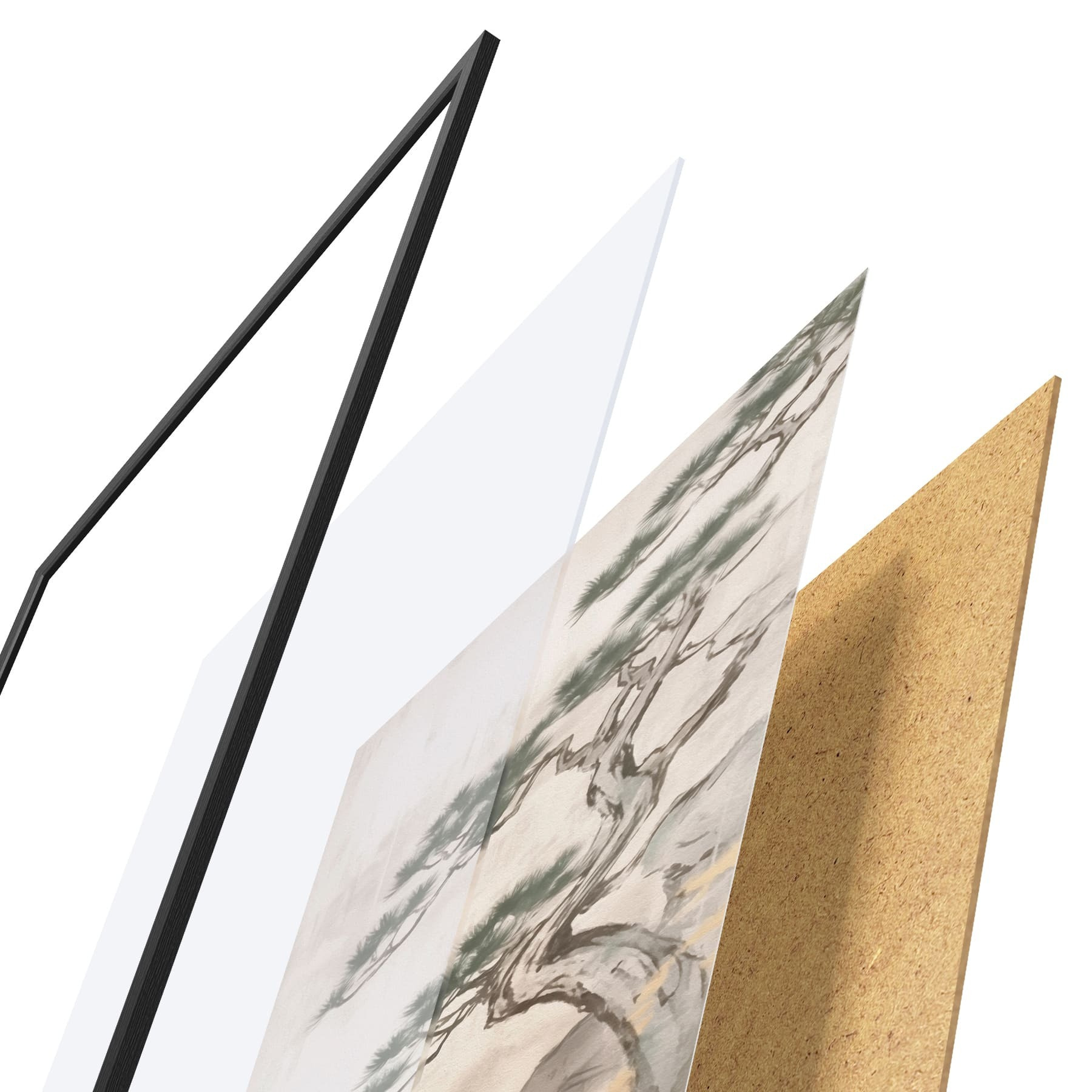 Das Poster besteht aus einem Rahmen, Plexiglas, einem gedruckten Bild und einer Rückwand aus Spanplatten. Dank der Halterungen auf der Rückseite kann das Poster sofort an die Wand gehängt werden.