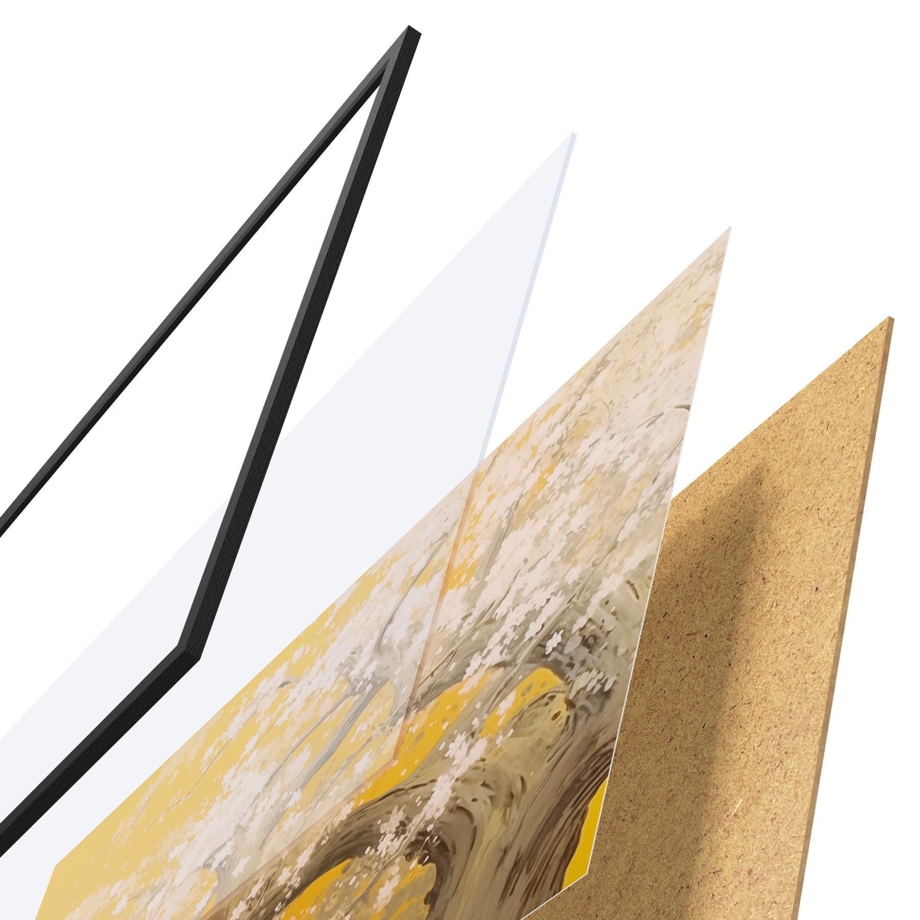 Das Poster besteht aus einem Rahmen, Plexiglas, einem gedruckten Bild und einer Rückwand aus Spanplatten. Dank der Halterungen auf der Rückseite kann das Poster sofort an die Wand gehängt werden.