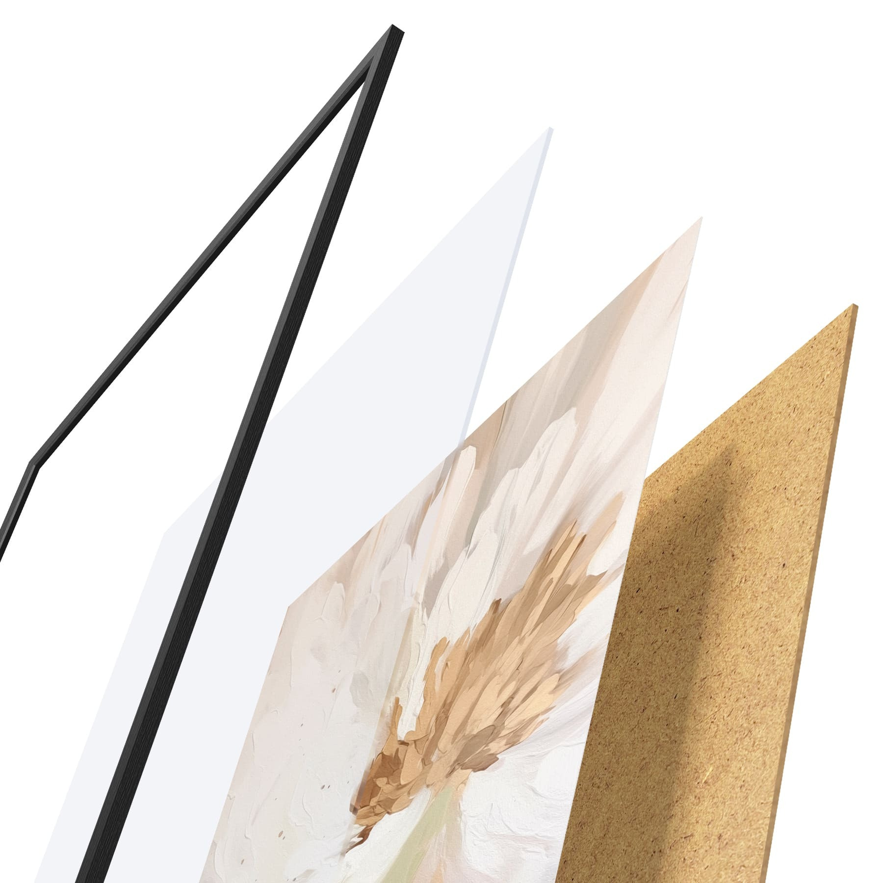 Das Poster besteht aus einem Rahmen, Plexiglas, einem gedruckten Bild und einer Rückwand aus Spanplatten. Dank der Halterungen auf der Rückseite kann das Poster sofort an die Wand gehängt werden.