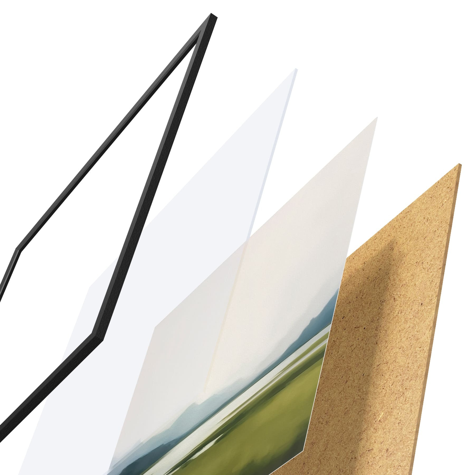 Das Poster besteht aus einem Rahmen, Plexiglas, einem gedruckten Bild und einer Rückwand aus Spanplatten. Dank der Halterungen auf der Rückseite kann das Poster sofort an die Wand gehängt werden.