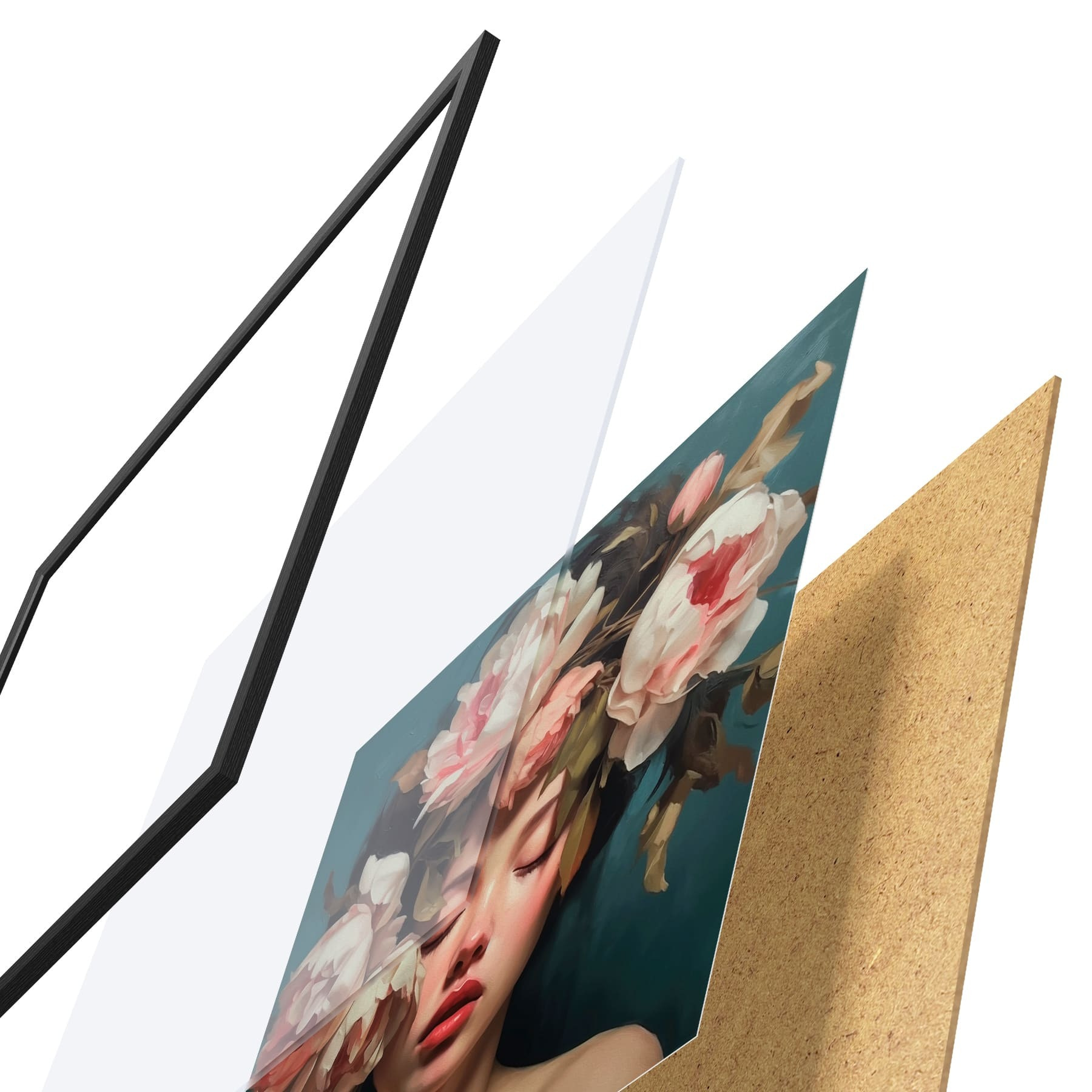 Das Poster besteht aus einem Rahmen, Plexiglas, einem gedruckten Bild und einer Rückwand aus Spanplatten. Dank der Halterungen auf der Rückseite kann das Poster sofort an die Wand gehängt werden.