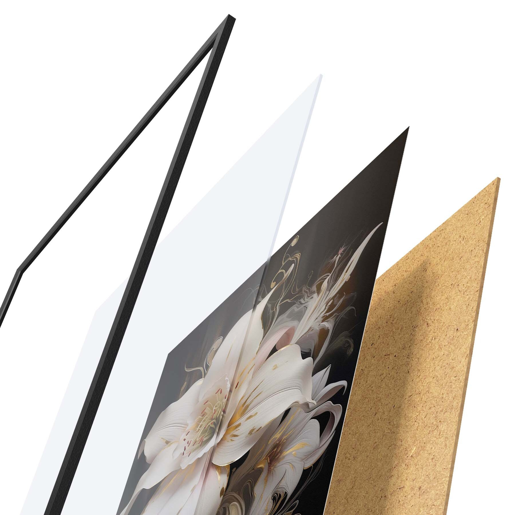 Das Poster besteht aus einem Rahmen, Plexiglas, einem gedruckten Bild und einer Rückwand aus Spanplatten. Dank der Halterungen auf der Rückseite kann das Poster sofort an die Wand gehängt werden.