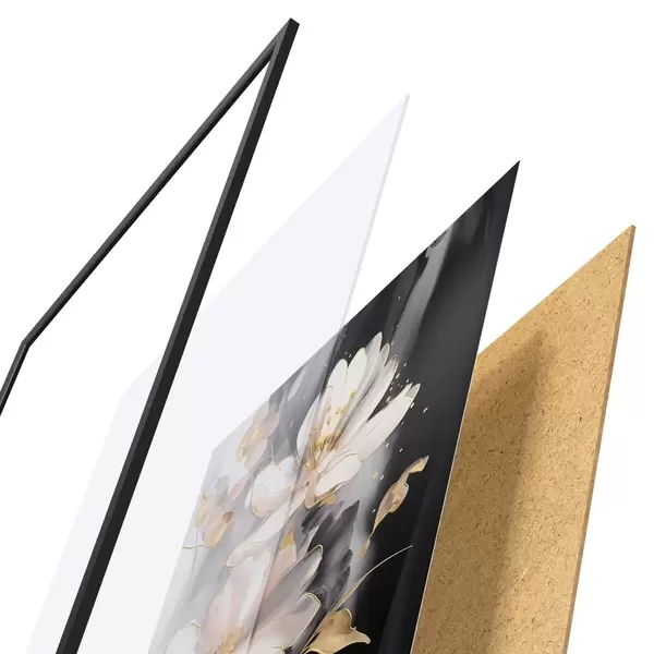 Das Poster besteht aus einem Rahmen, Plexiglas, einem gedruckten Bild und einer Rückwand aus Spanplatten. Dank der Halterungen auf der Rückseite kann das Poster sofort an die Wand gehängt werden.