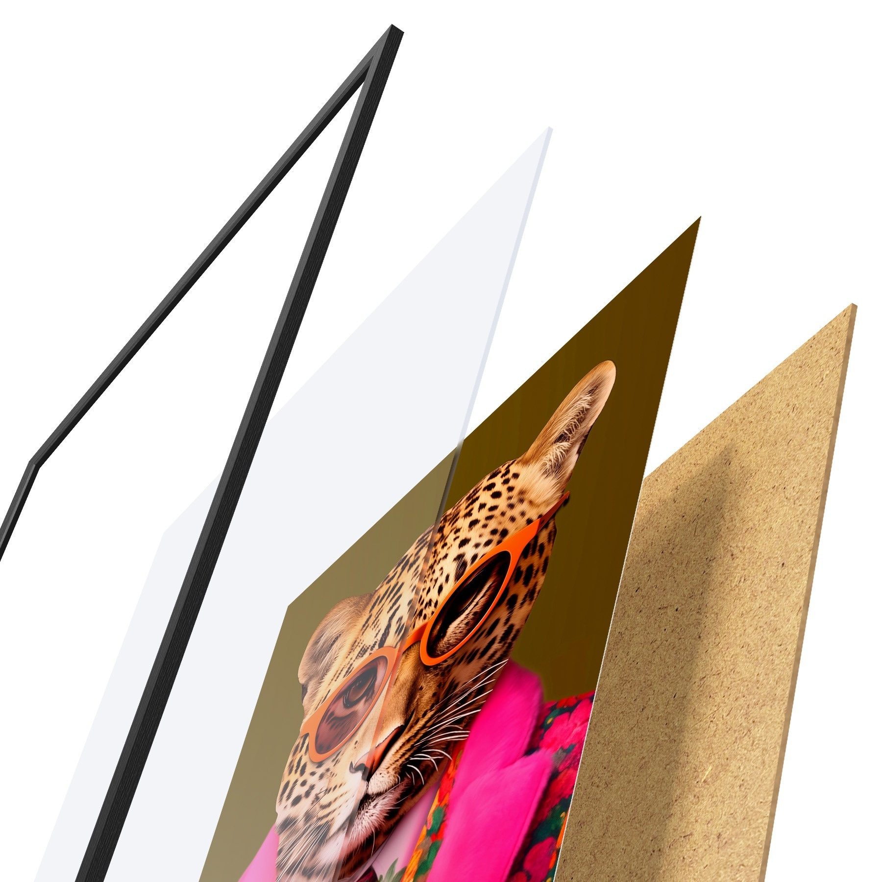 Das Poster besteht aus einem Rahmen, Plexiglas, einem gedruckten Bild und einer Rückwand aus Spanplatten. Dank der Halterungen auf der Rückseite kann das Poster sofort an die Wand gehängt werden.