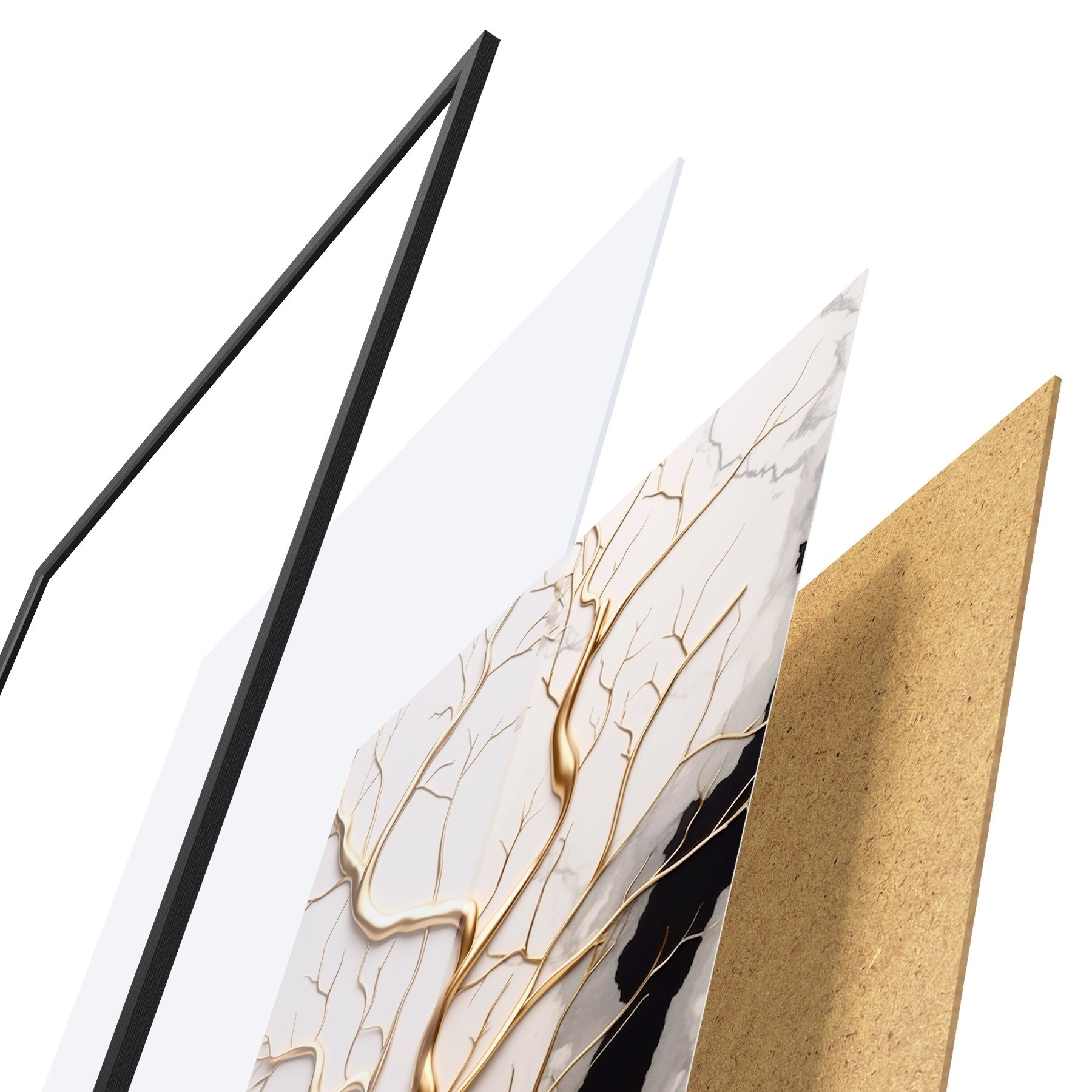 Das Poster besteht aus einem Rahmen, Plexiglas, einem gedruckten Bild und einer Rückwand aus Spanplatten. Dank der Halterungen auf der Rückseite kann das Poster sofort an die Wand gehängt werden.