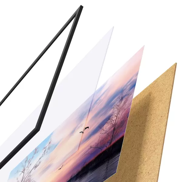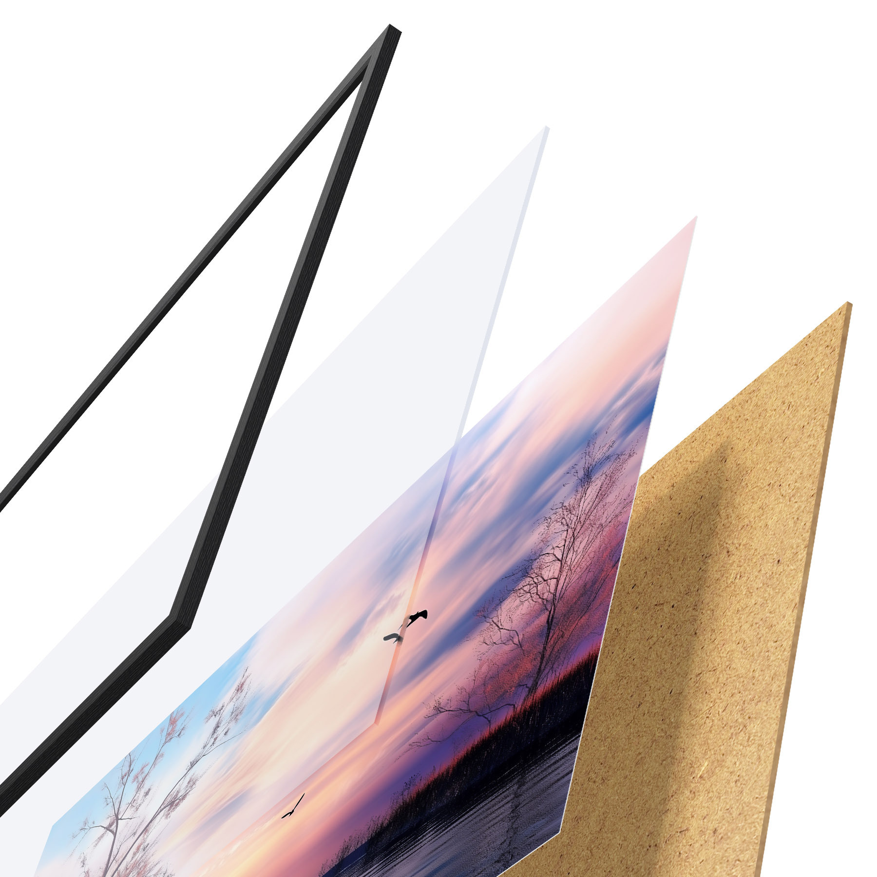 Das Poster besteht aus einem Rahmen, Plexiglas, einem gedruckten Bild und einer Rückwand aus Spanplatten. Dank der Halterungen auf der Rückseite kann das Poster sofort an die Wand gehängt werden.