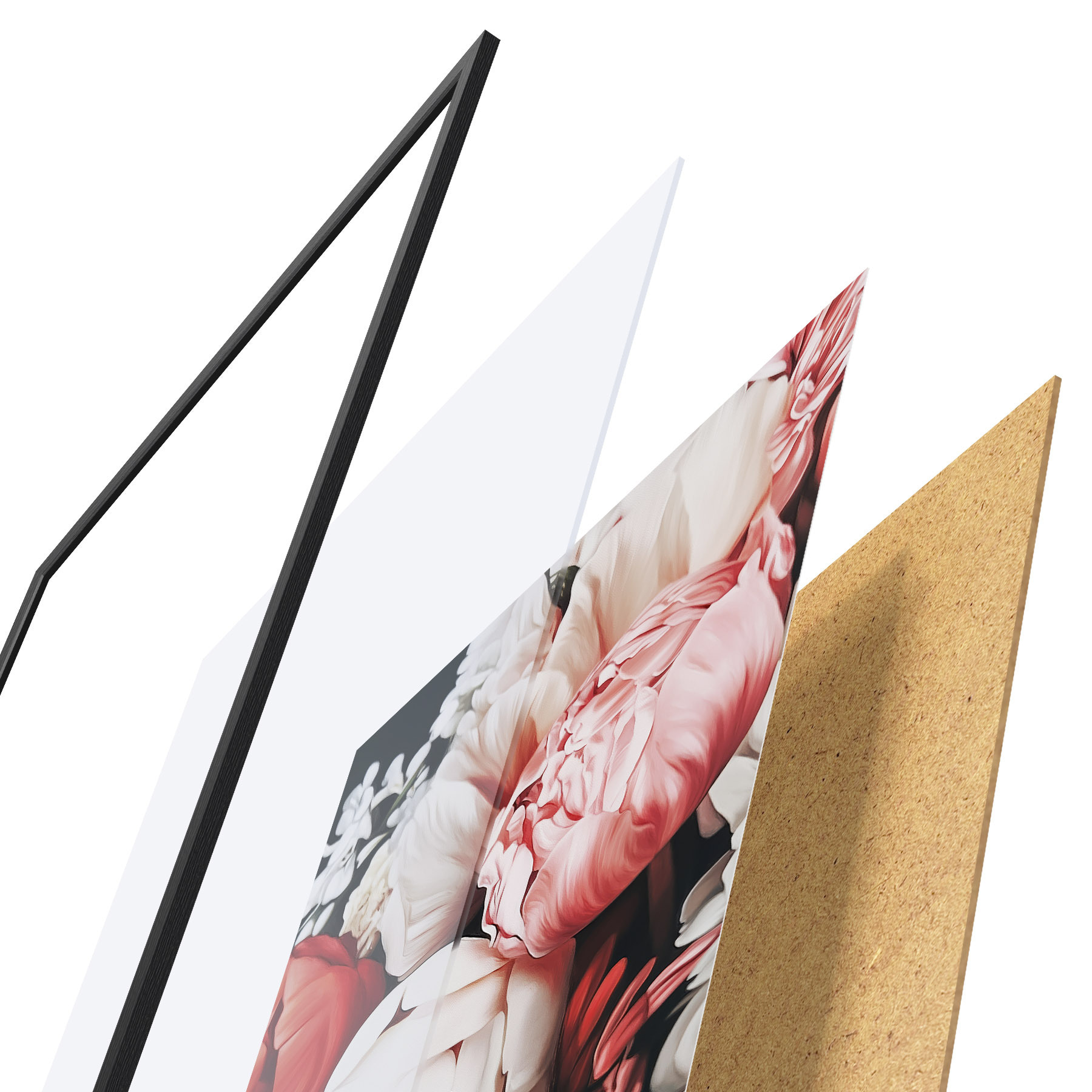 Das Poster besteht aus einem Rahmen, Plexiglas, einem gedruckten Bild und einer Rückwand aus Spanplatten. Dank der Halterungen auf der Rückseite kann das Poster sofort an die Wand gehängt werden.