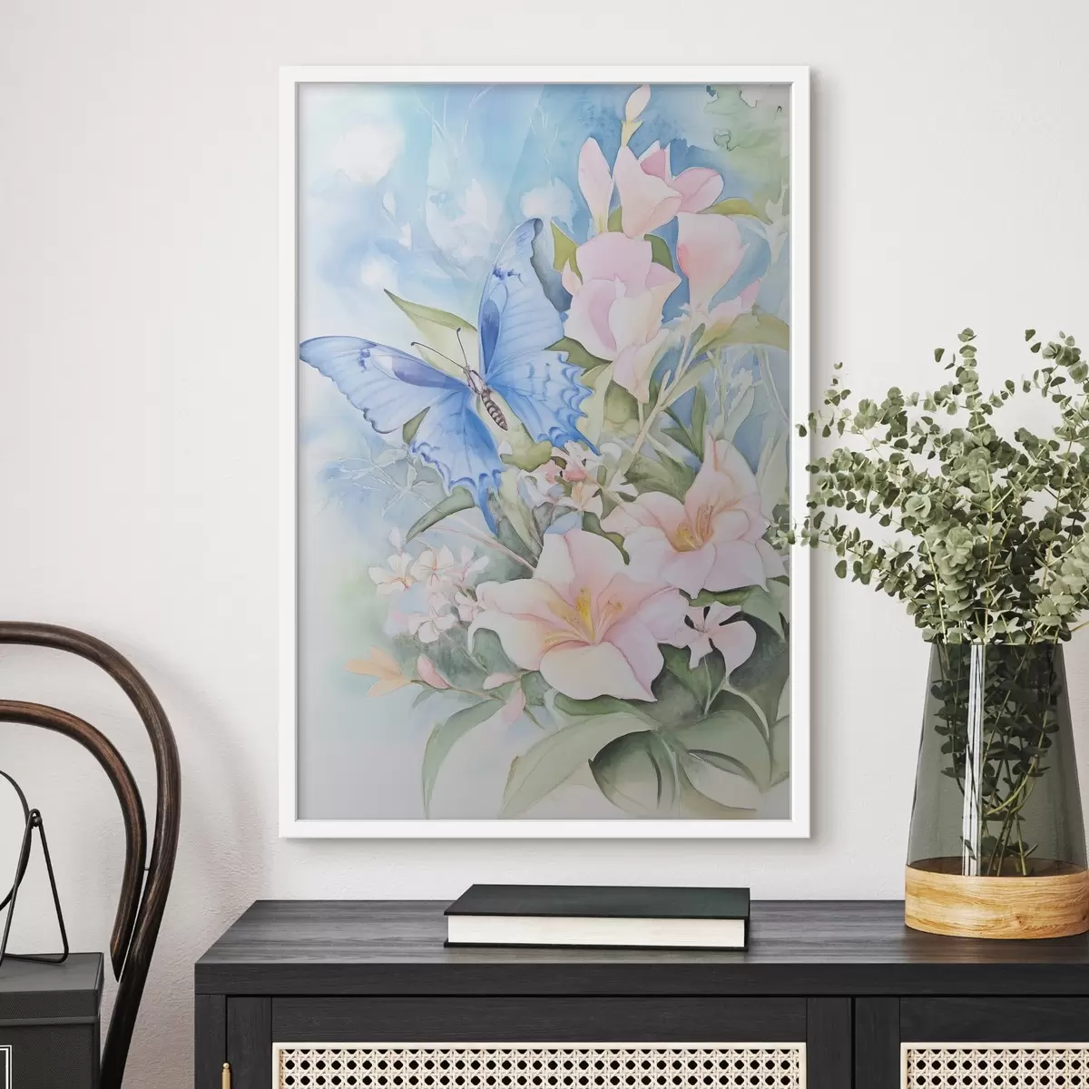 Poster Blauer Schmetterling und rosa Blumen Nr f43296