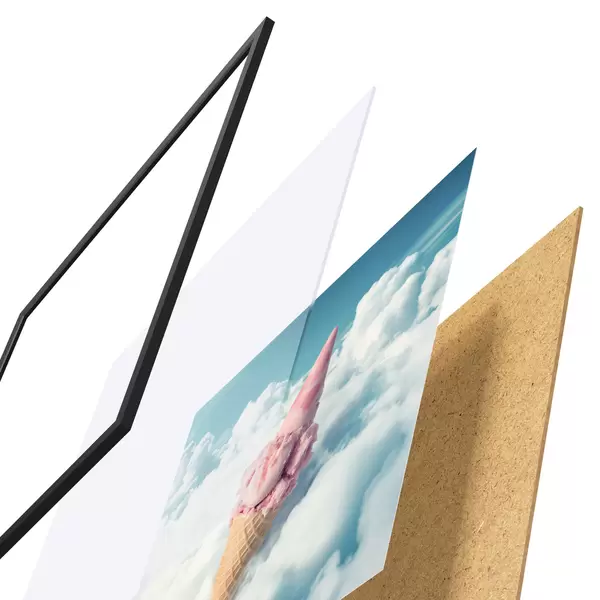 Das Poster besteht aus einem Rahmen, Plexiglas, einem gedruckten Bild und einer Rückwand aus Spanplatten. Dank der Halterungen auf der Rückseite kann das Poster sofort an die Wand gehängt werden.