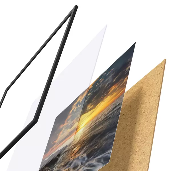 Das Poster besteht aus einem Rahmen, Plexiglas, einem gedruckten Bild und einer Rückwand aus Spanplatten. Dank der Halterungen auf der Rückseite kann das Poster sofort an die Wand gehängt werden.