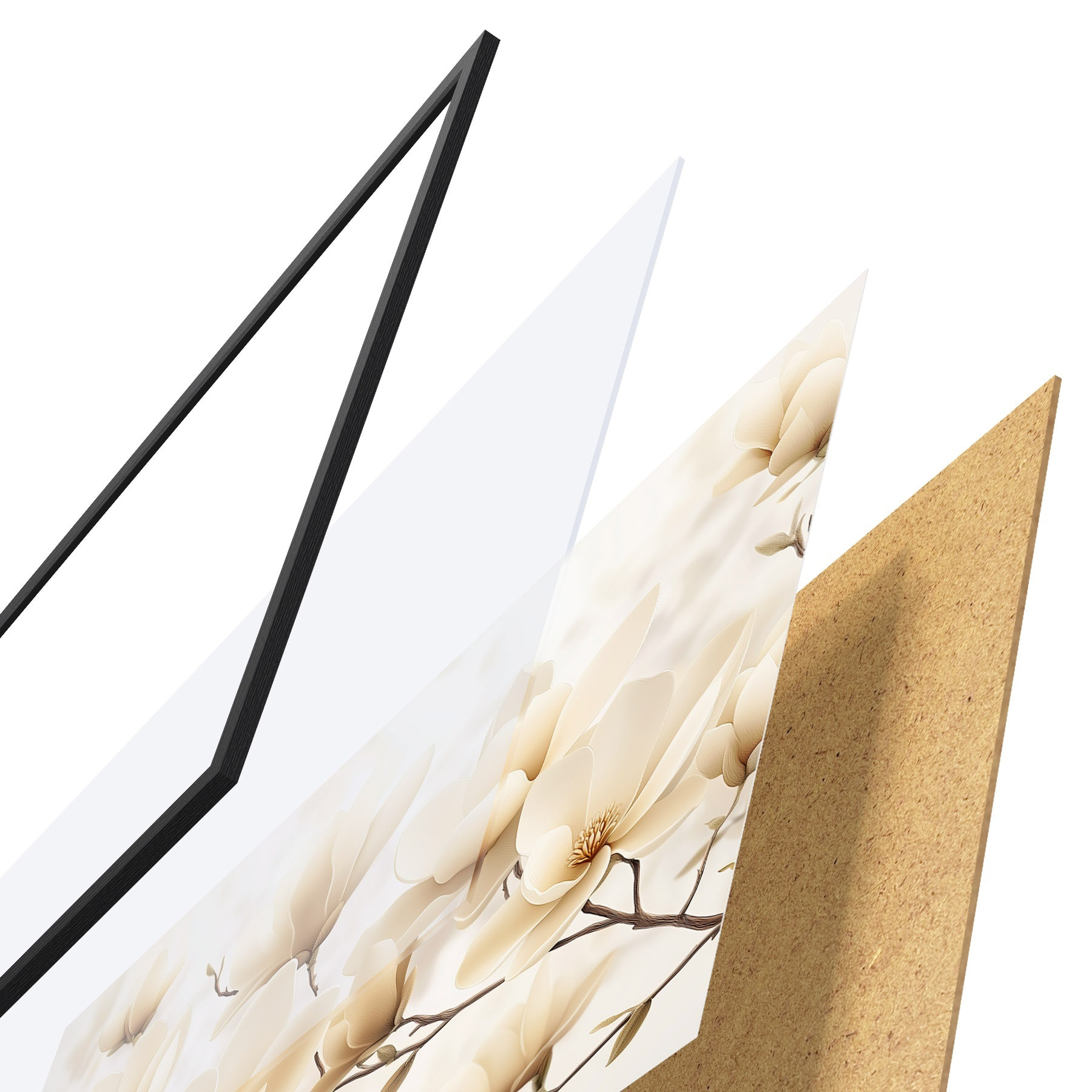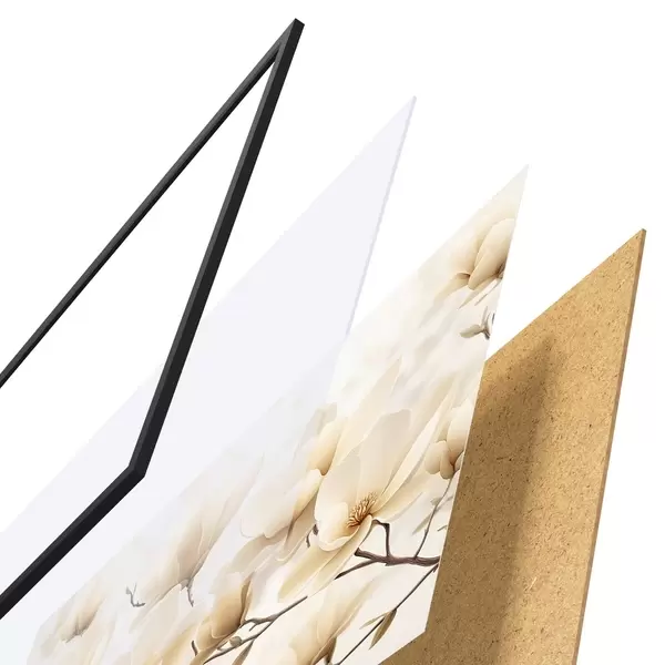 Das Poster besteht aus einem Rahmen, Plexiglas, einem gedruckten Bild und einer Rückwand aus Spanplatten. Dank der Halterungen auf der Rückseite kann das Poster sofort an die Wand gehängt werden.