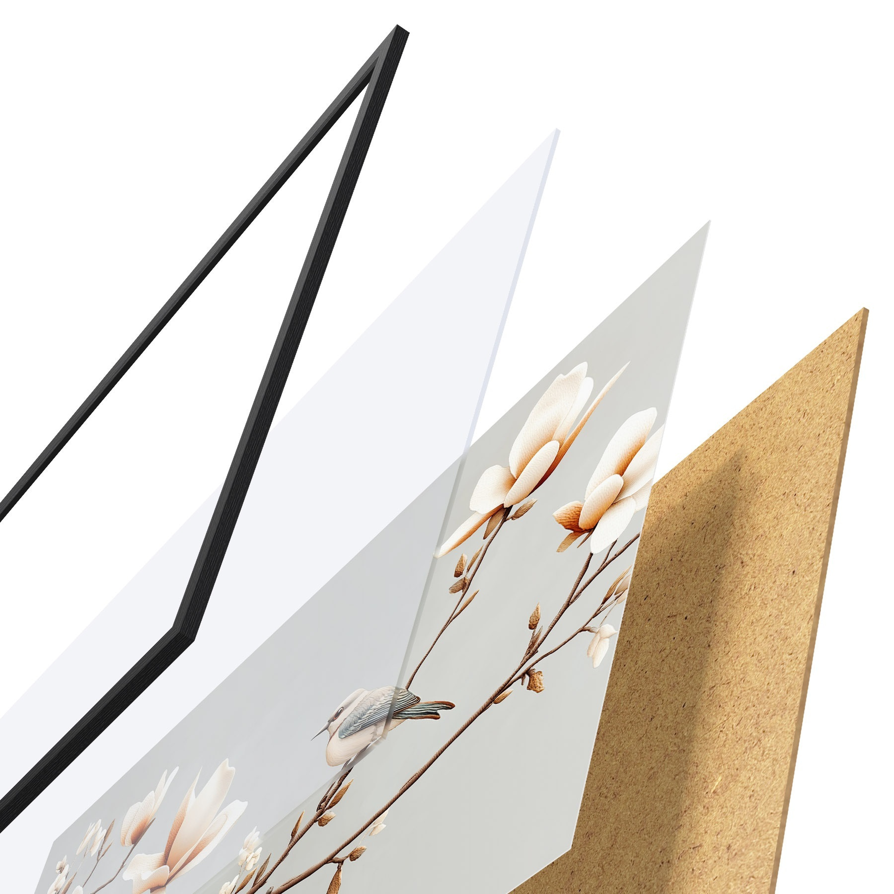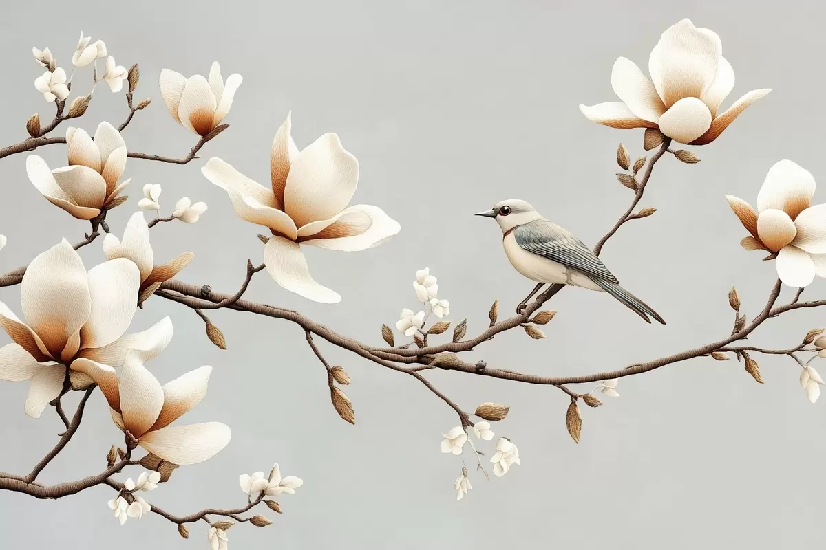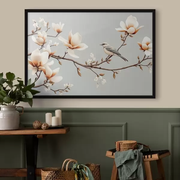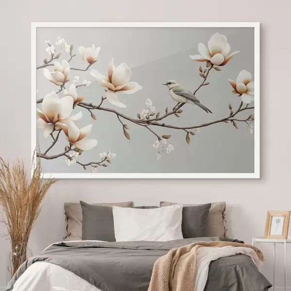 Poster Vogel auf einem Zweig mit Magnolien in sanften Pastellfarben Nr f43320