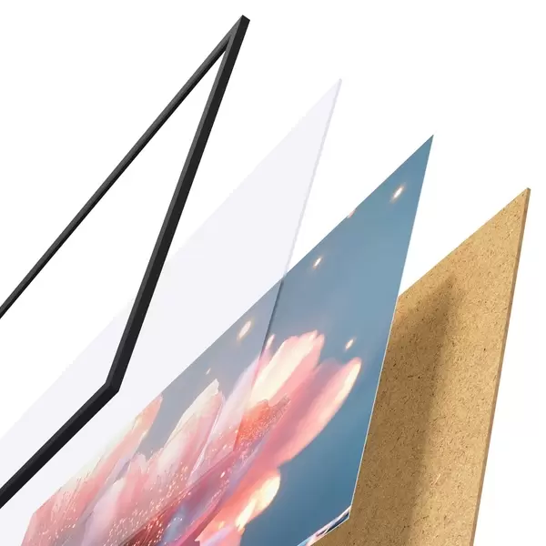 Das Poster besteht aus einem Rahmen, Plexiglas, einem gedruckten Bild und einer Rückwand aus Spanplatten. Dank der Halterungen auf der Rückseite kann das Poster sofort an die Wand gehängt werden.