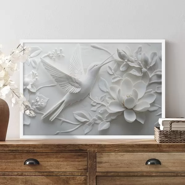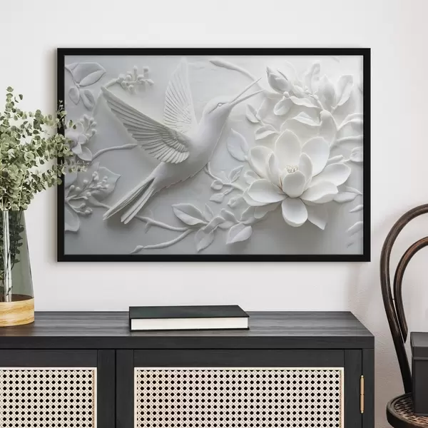 Poster Schwarz und weiß 3d Bild eines Vogels und umliegenden Blumen Nr f43329