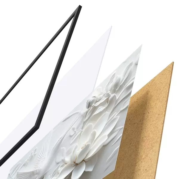 Das Poster besteht aus einem Rahmen, Plexiglas, einem gedruckten Bild und einer Rückwand aus Spanplatten. Dank der Halterungen auf der Rückseite kann das Poster sofort an die Wand gehängt werden.