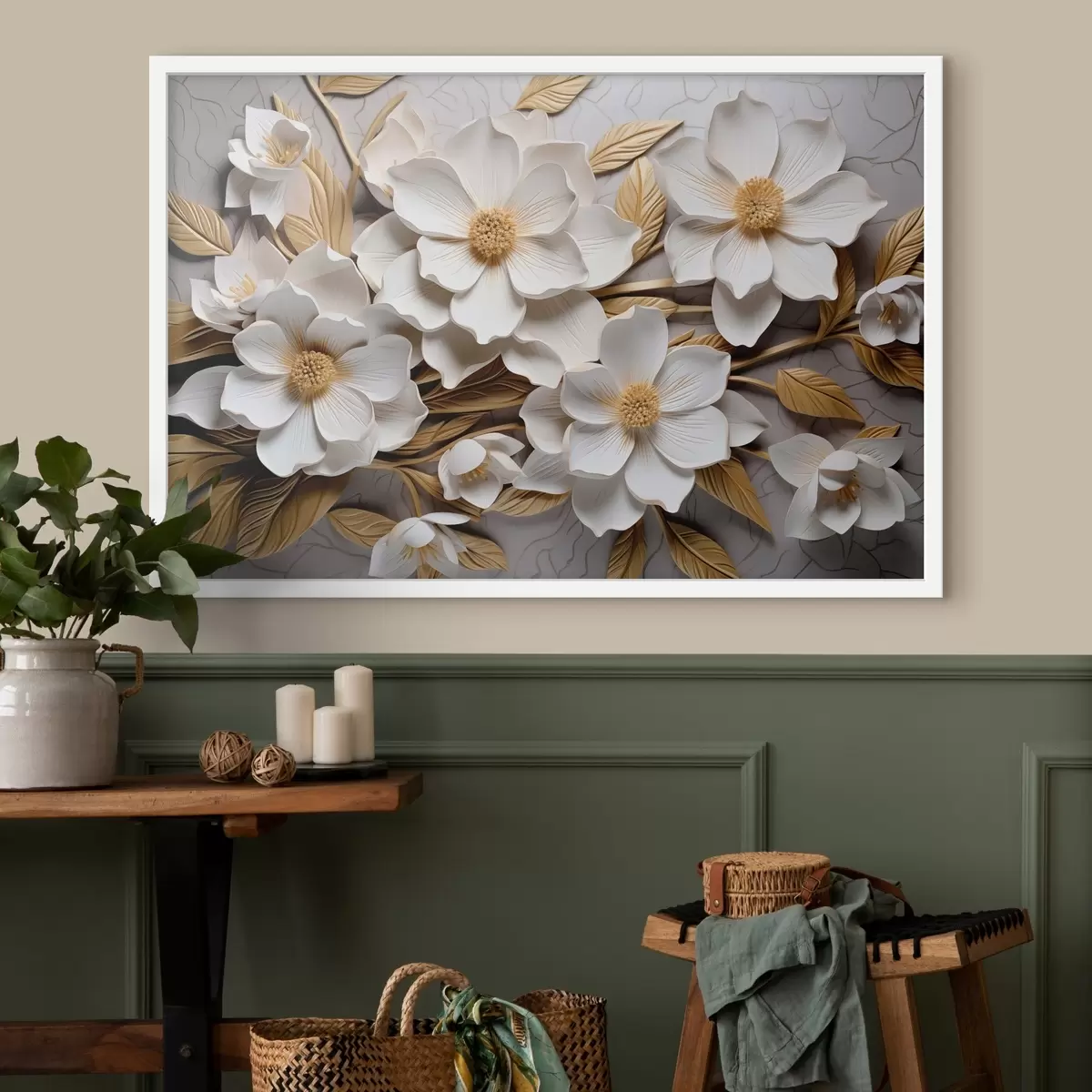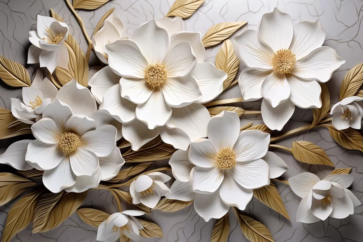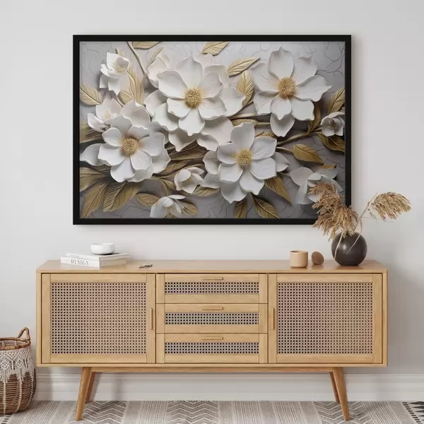 Poster Weiße Blüten im Stil eines Freskenreliefs mit gelben Blättern und Staubgefäßen Nr f43330