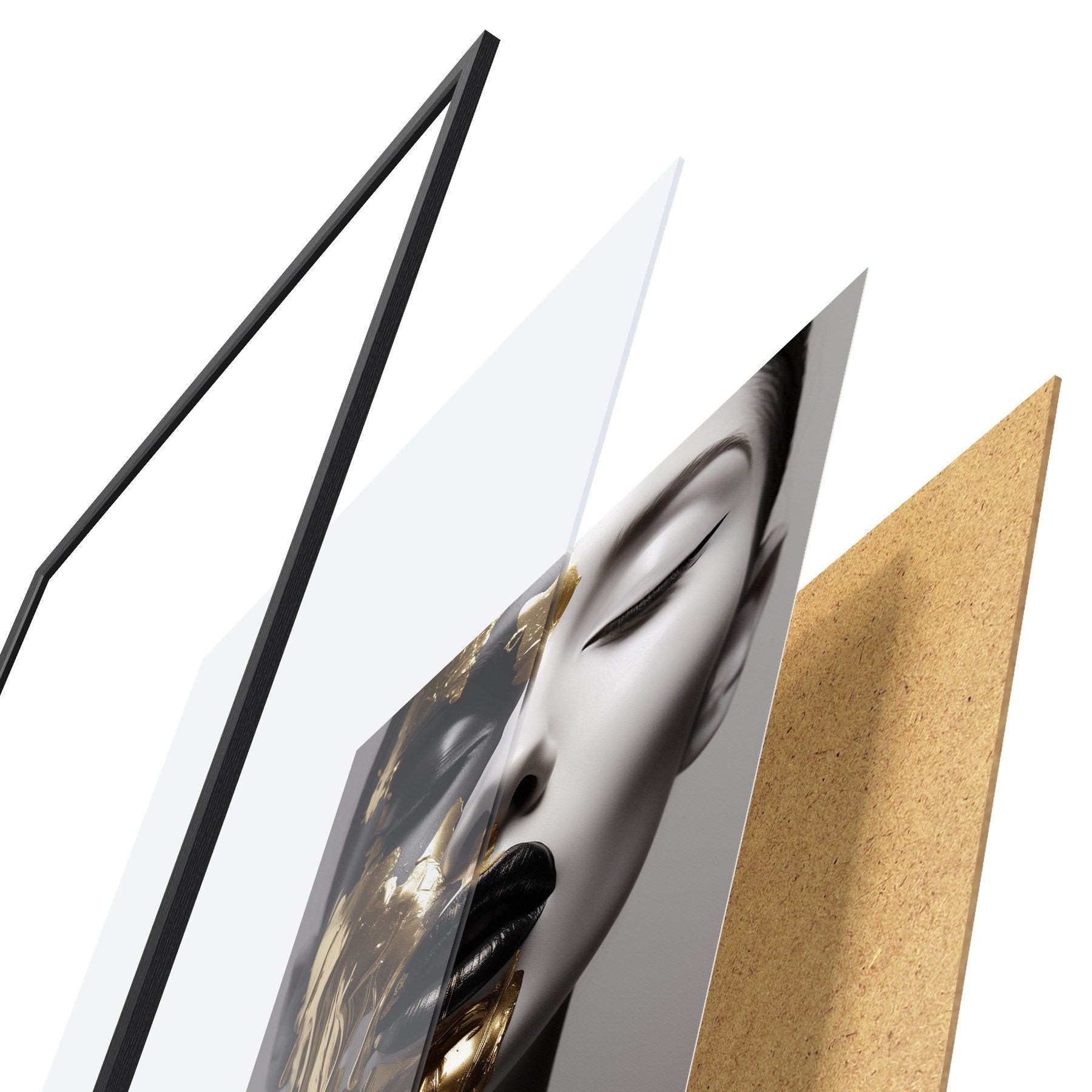 Das Poster besteht aus einem Rahmen, Plexiglas, einem gedruckten Bild und einer Rückwand aus Spanplatten. Dank der Halterungen auf der Rückseite kann das Poster sofort an die Wand gehängt werden.