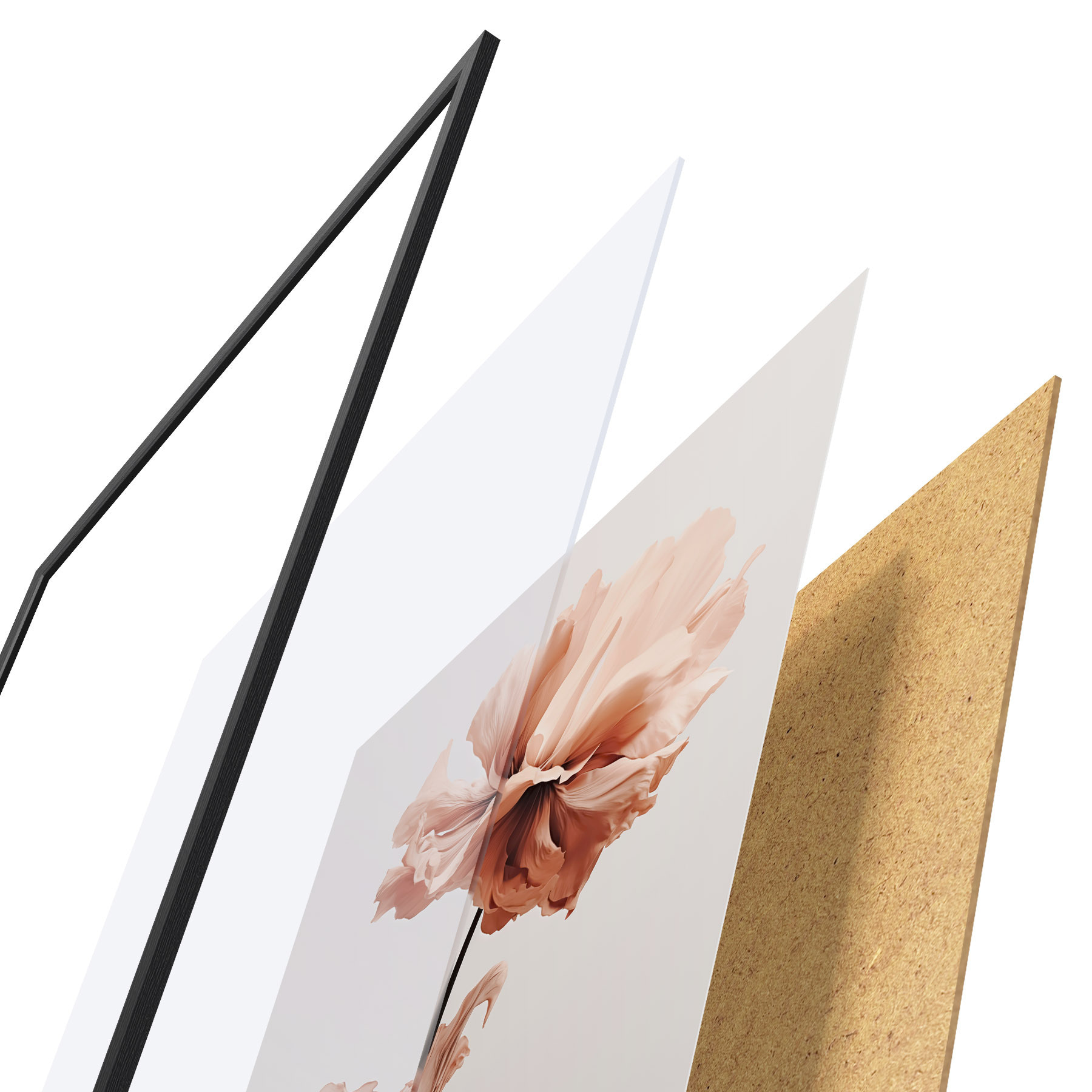 Das Poster besteht aus einem Rahmen, Plexiglas, einem gedruckten Bild und einer Rückwand aus Spanplatten. Dank der Halterungen auf der Rückseite kann das Poster sofort an die Wand gehängt werden.