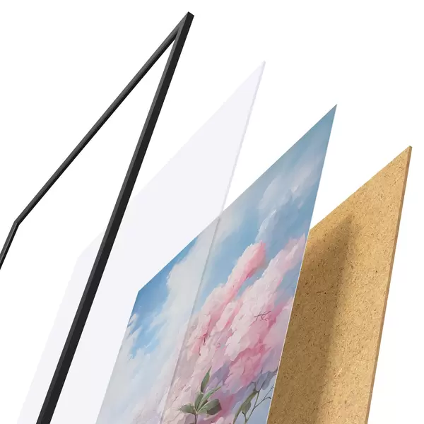 Das Poster besteht aus einem Rahmen, Plexiglas, einem gedruckten Bild und einer Rückwand aus Spanplatten. Dank der Halterungen auf der Rückseite kann das Poster sofort an die Wand gehängt werden.