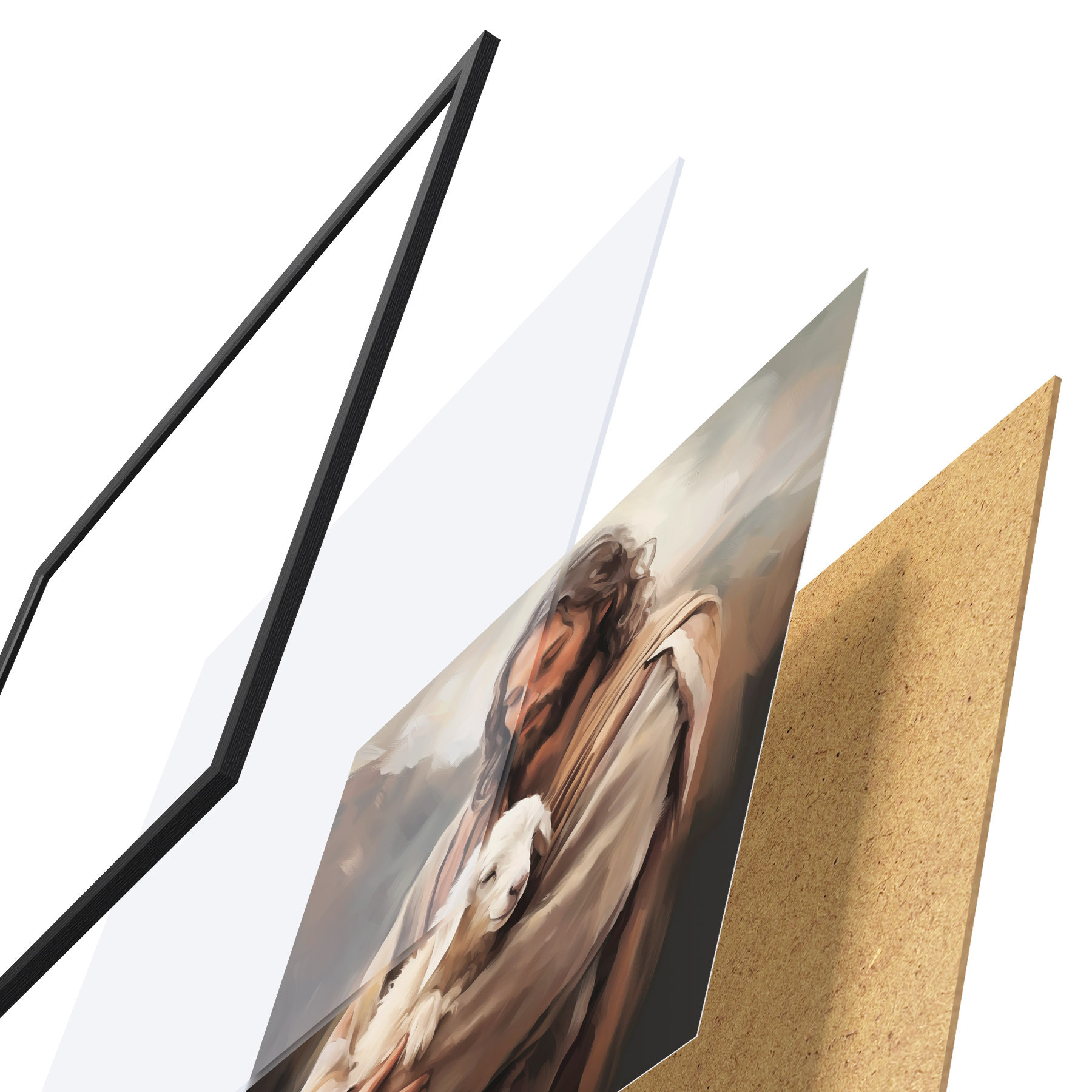 Das Poster besteht aus einem Rahmen, Plexiglas, einem gedruckten Bild und einer Rückwand aus Spanplatten. Dank der Halterungen auf der Rückseite kann das Poster sofort an die Wand gehängt werden.