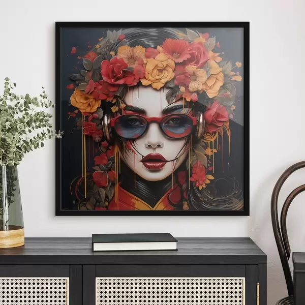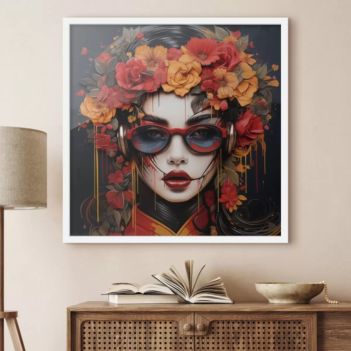 Poster Frau mit Blumen auf dem Kopf, Streetart-Stil f43362