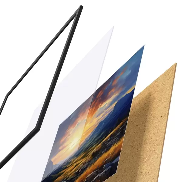 Das Poster besteht aus einem Rahmen, Plexiglas, einem gedruckten Bild und einer Rückwand aus Spanplatten. Dank der Halterungen auf der Rückseite kann das Poster sofort an die Wand gehängt werden.